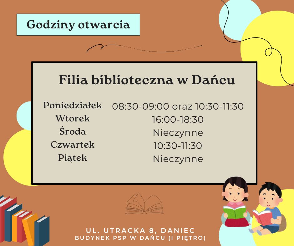 Filia Gminnej Biblioteki Publicznej w Dańcu Budynek Szkoły Podstawowej przy ulicy Utrackiej 8 w Dańcu.