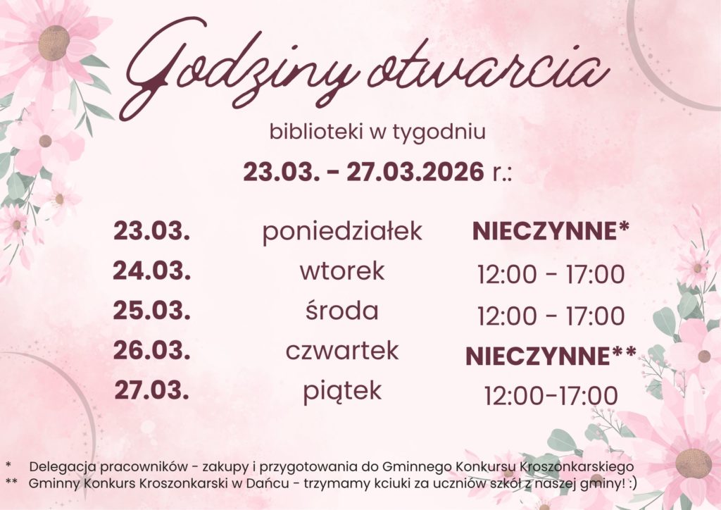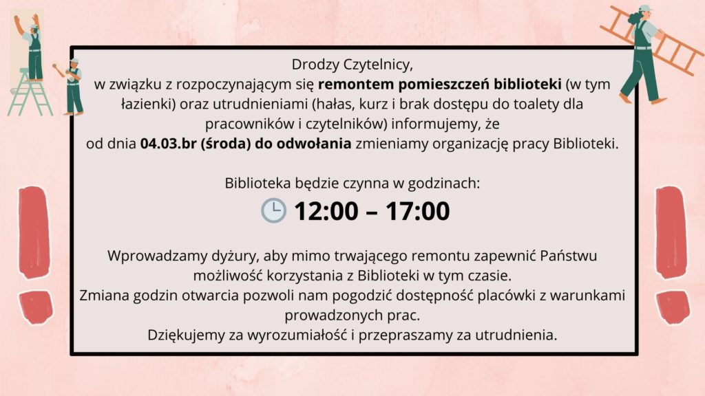 Jednocześnie przypominamy, że wszelkie informacje o ewentualnych zmianach w godzinach otwarcia publikujemy na naszym Facebooku, stronie internetowej biblioteki oraz w gablocie przed wejściem do budynku.